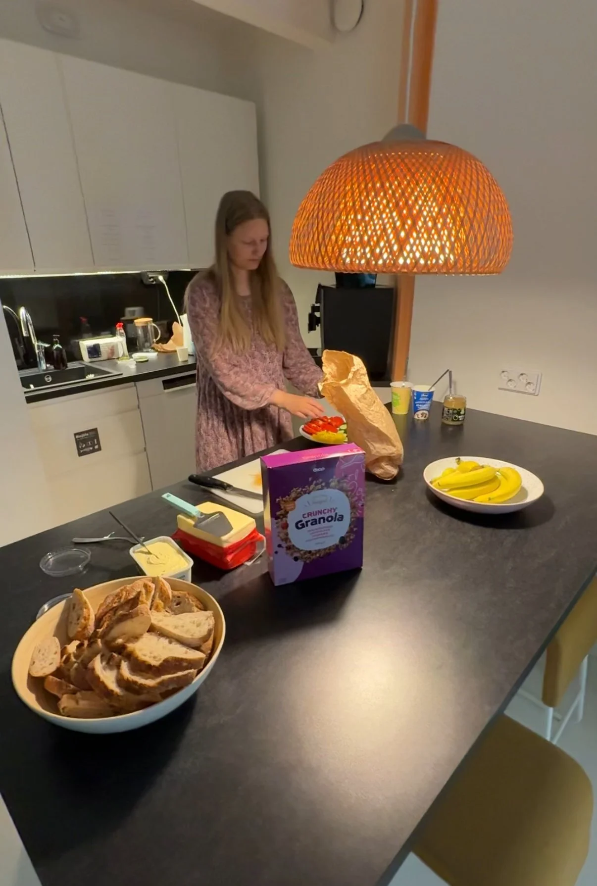 Mestan toinen perustajista Mirka laittamassa aamupalaa valmiiksi.